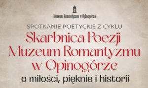 „Skarbnica Poezji” 26 kwietnia, godzina 15:00 Zapraszamy na kolejne spotkanie poetyckie z cyklu „Skarbnica Poezji”, które odbędzie się 26 kwietnia 2026 godz. 15:00 Oranżeria, Muzeum