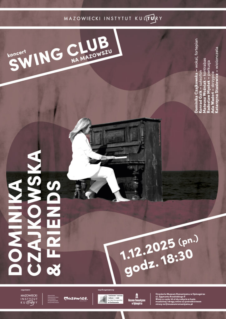 W ramach porozumienia zawartego ze względu na rozbudowę siedziby z Powiatowe Centrum Kultury i Sztuki w Ciechanowie , zapraszamy na koncert SWING CLUB na Mazowszu pt. „Dominika Czajkowska & Friends” do muzealnej Oranżerii, który odbędzie się 🎷1 grudnia 2025 r. o godzinie 18:30. W roku 2025 Mazowiecki Instytut Kultury prezentuje dziesiątą edycję cyklu Swing Club na Mazowszu. Program jest zróżnicowany stylistycznie ─ od jazzu tradycyjnego, poprzez swing, do bardziej współczesnych form jazzowych. Będzie to niezwykłe wydarzenie, podczas którego artyści zabiorą słuchaczy w muzyczną podróż przez autorskie kompozycje, filmowe inspiracje oraz jazzowe interpretacje popowych hitów. Podczas koncertu usłyszymy utwory z debiutanckiej płyty Północ, prapremierowe kompozycje z nadchodzącego albumu oraz autorskie, jazzowe interpretacje utworów Beyoncé czy Dua Lipy. Jazzowy temperament i filmowa wrażliwość wykreują wieczór pełen muzycznych kontrastów.