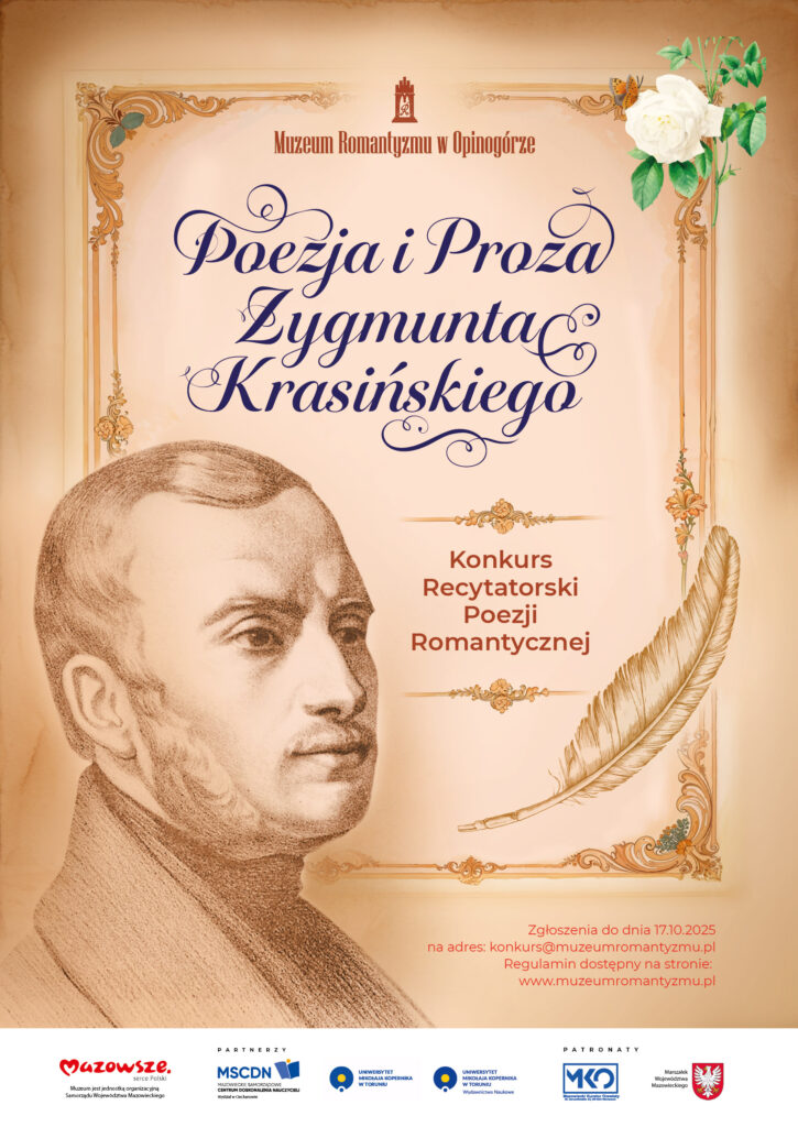 z wielką przyjemnością zapraszamy młodzież do udziału w kolejnej edycji organizowanego przez Muzeum Romantyzmu w Opinogórze, Konkursu Recytatorskiego Poezji Romantycznej. Tym razem to Poezja i Proza Zygmunta Krasińskiego. Konkursowi przyświeca rocznica 190. lat, jakie w 2025 r. upływają od pierwszej publikacji „Nie-Boskiej komedii” Zygmunta Krasińskiego (wydanie: 1835 r., Paryż).