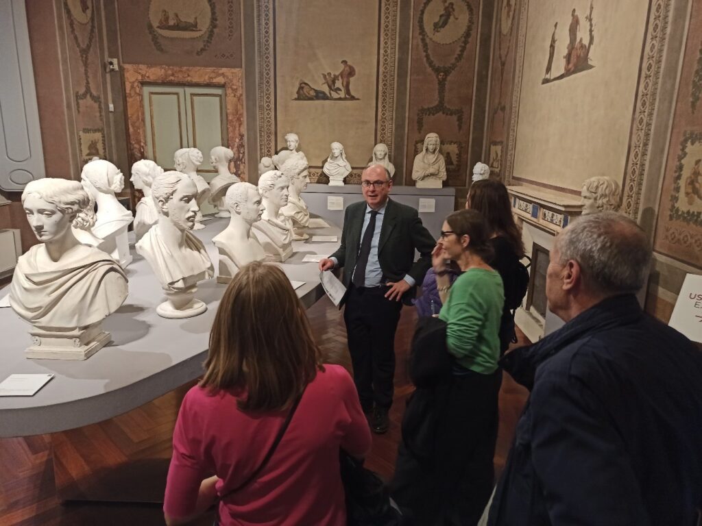 Głównym celem było omówienie wspólnej wystawy w Muzeum Romantyzmu w Opinogórze m.in. rzeźbiarskich poloników oraz portretów, których twórcą był znany włoski artysta Pietro Tenerani (1789-1869) wraz z Musei Civici di Roma w Polsce w Opinogórze. Strona włoska przedstawiła założenia wystawy stałej prezentującej rzeźbiarza Pietro Teneraniego oraz jego związki z Polską. Pani Prof. Ilaria Miarelli Mariani oraz Pan Fabio Benedettucci bardzo gorąco zachęcali nas do podjęcia kroków, aby zrealizować wspólną wystawę. Omówiliśmy podstawowe sprawy dotyczące tego zadania jak sposób wypożyczenia, wspólnego scenariusza, ustaliliśmy datę wystawy – wstępnie na rok 2026. W czasie kwerendy zbiorów okazało się, że muzeum posiada w swoich zbiorach ponad 500 zabytków związanych z osobą rzeźbiarza takich jak fotografie, rzeźby w gipsie i marmurze – w tym dużo poloników związanych m.in. z rodzinami Branickich, Krasińskich, Potockich, Komarów oraz ich znajomych i przyjaciół zagranicznych. Jest również kilka rzeźb, o nieustalonej tożsamości portretowanych, które na prośbę strony włoskiej będziemy starali się zidentyfikować.