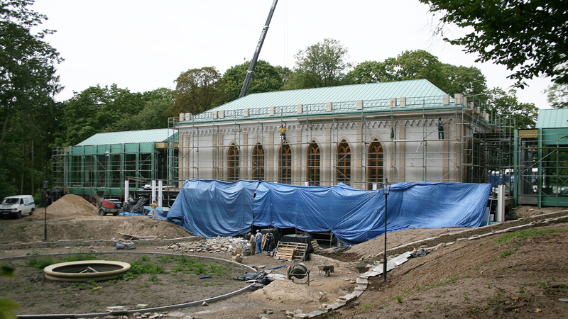 Założono odbudowę Oranżerii w zakresie odnoszącym się do jej historycznej funkcji (szklarnie), z przeznaczeniem centralnej części obiektu na działalność koncertowo – teatralną i konferencyjno – szkoleniową, zachodniego pawilonu na oranżerię i wschodniego pawilonu na pomieszczenia z funkcją wystawienniczą z holem wejściowym na dolnej kondygnacji. W pierwszym etapie powstał budynek centralny Oranżerii.