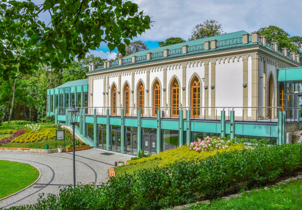 Budynek Oranżerii funkcjonował na terenie Zespołu Parkowego do końca XIX w. W latach 60-tych ubiegłego stulecia zostały podjęte działania mające na celu odtworzenie budynku w formie nawiązującej do obiektów znajdujących się na terenie Zespołu Parkowego. Odnalezione w piwnicach zameczku fragmenty dokumentacji projektowej, stanowiły podstawę do opracowania materiałów, które pozwoliłyby na realizację projektu. Przeprowadzone prace budowlane zostały poprzedzone badaniami archeologicznymi, które ukazały kształt oraz formę XIX w. budynku. Odsłonięte piwnice budynku pozwoliły na szczegółowe określenie rozmiarów historycznego obiektu, oraz dostosowanie współczesnej formy do wymagań konserwatorskich i założeń parkowych.
